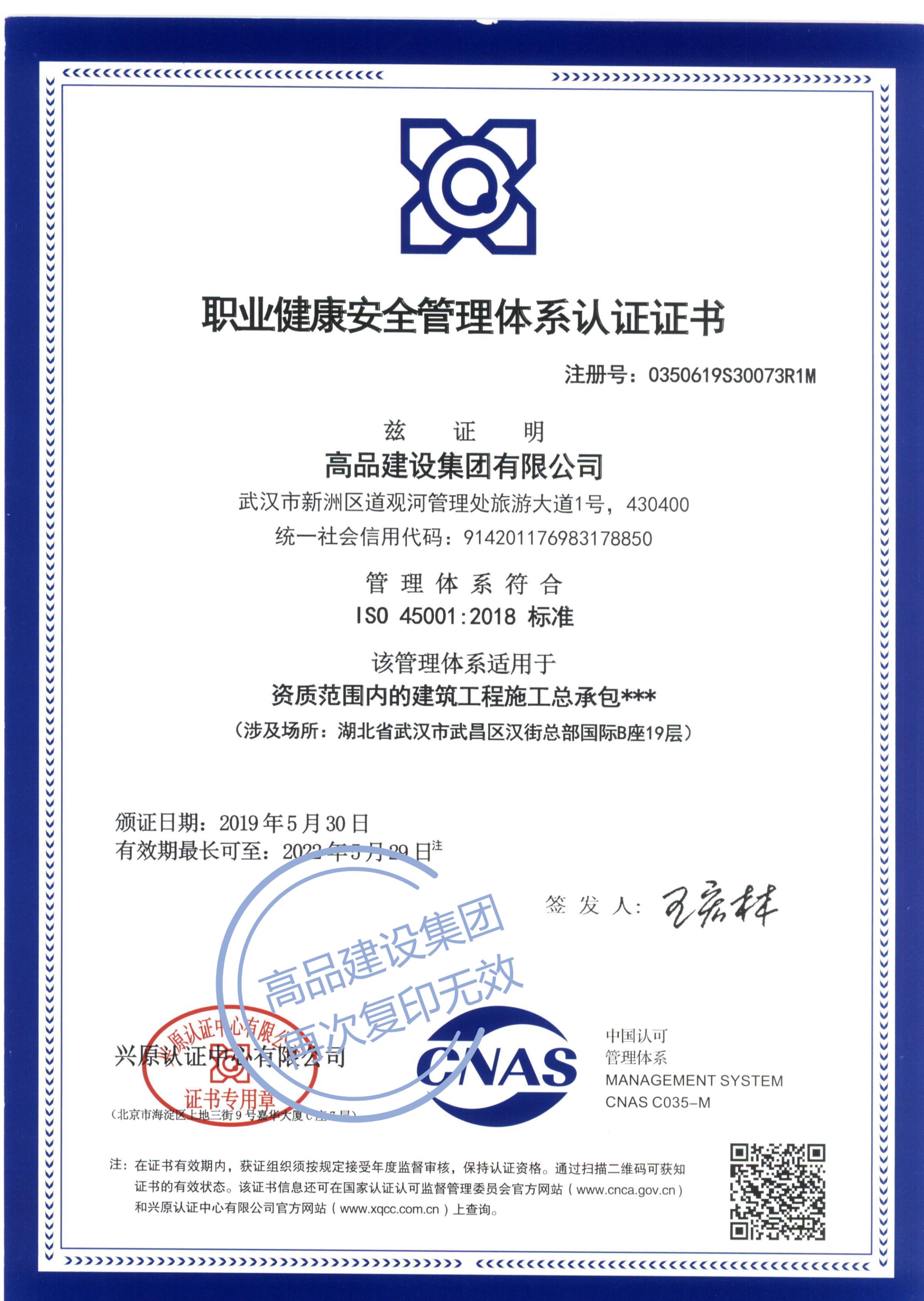 職業健康安全管理體系認證證書